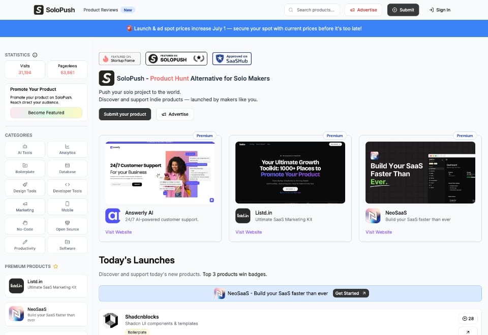 Another Vibe Coder just hit $7.5K in revenue with a vibe coded app—SoloPush. Launched on April 1st, and just three months in, it’s already brought in $7.5K total revenue, $1K MRR, 1,000+ products listed, 2,200+ users, and 45K+ product views all without any ads or big launch campaigns, just posts on Reddit and Twitter. Listing a product is completely free, with optional paid boosts for more visibility. (Source)